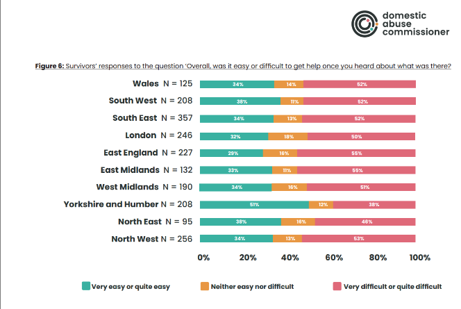 Only a third of survivors in London found it easy or very easy to get help once they knew what support was available according to Domestic Abuse Commissioner’s 2022 report, the second lowest response in the country.