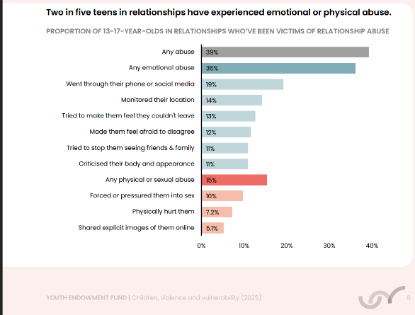 The Youth Endowment Fund’s 2025 report on Children, Violence and Vulnerability showed almost 40% of teens in relationships reported experiencing emotional or physical abuse from a sample of 11,000.