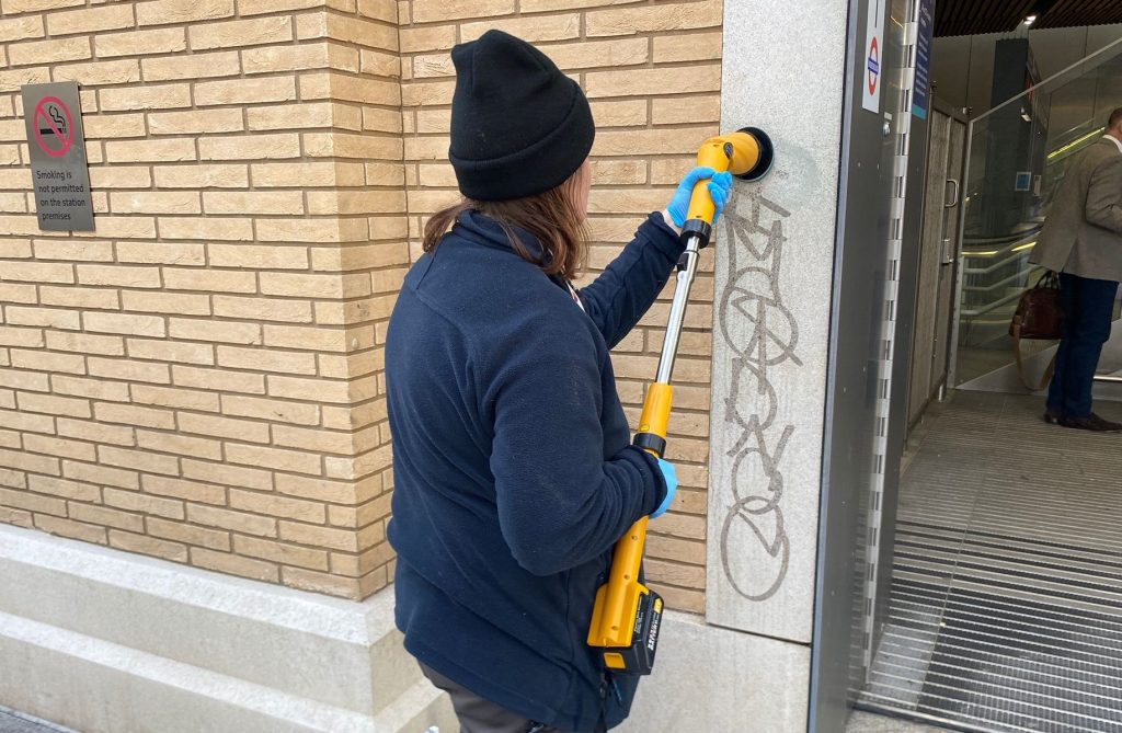 A TfL worker tasked with removing graffiti from outside London Bridge Station. Credit: Myfanwy Fleming-Jones