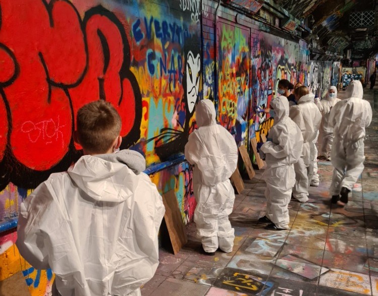 Each session, which takes place fortnightly, sees 10-15 children clad in PPE spraying their designs onto walls, sculptures and t-shirts.