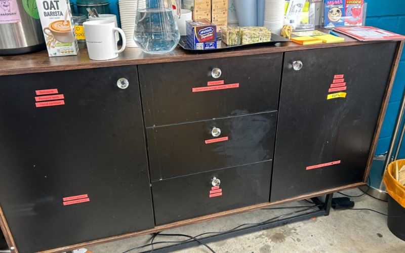 In the cabinets, they have freely available naloxone, unused syringes, test strips, menstrual products and sexual health products.